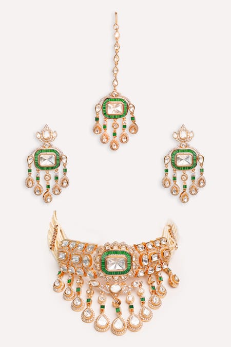 Green designer jewellery set featuring a necklace, pair of earrings, and maangtikka. Crafted from a silver and copper mix with gold finish plating and adorned with Kundan and Polki stones.