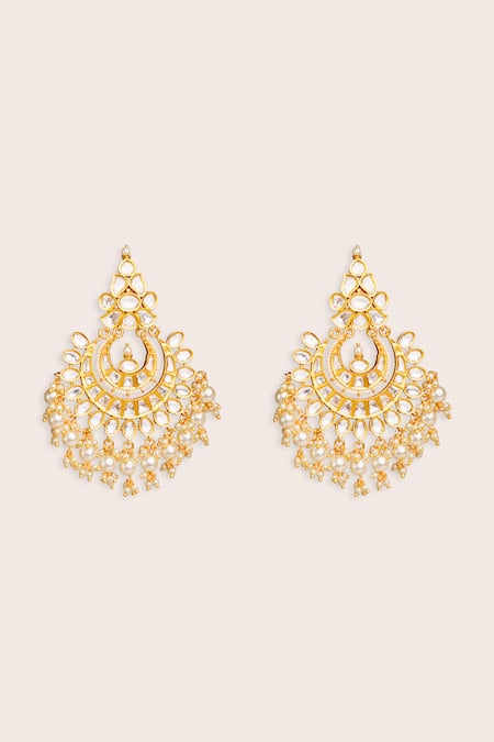 Intricate Kundan and Polki stone detailing, Chandbali inspired design, Gold finish with hanging embellishments