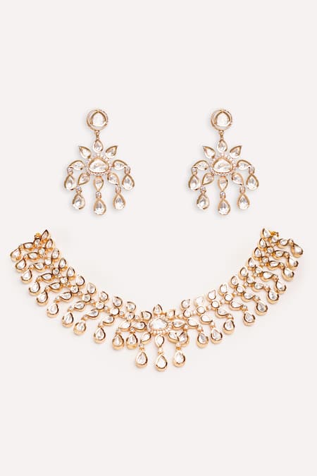 Gold finish necklace featuring Kundan and Polki stones with intricate designs. Paired with matching earrings adorned with similar stone embellishments.