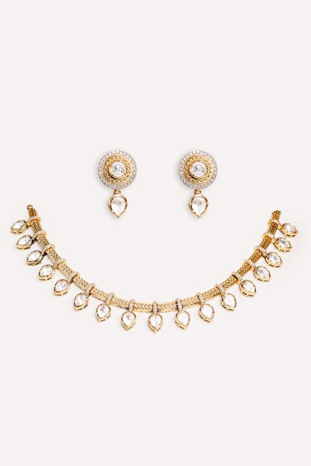 Gold finish necklace featuring Kundan and Polki stones with a delicate design. Accompanied by matching earrings that complement the necklace's aesthetic.