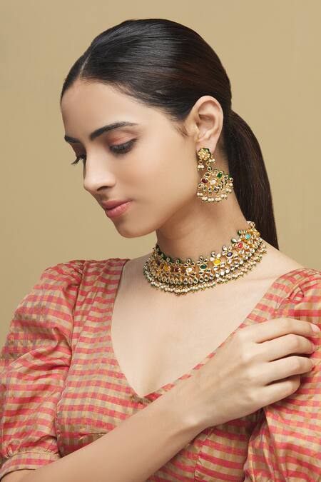 Multi color necklace featuring 22kt gold plating with navrattan stones, kundan, and pearl drops. Paired with a matching pair of dangler earrings.