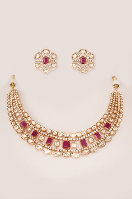 Intricate layered necklace with vibrant red stones, Matching earrings with floral design, Sparkling moissanite stones throughout