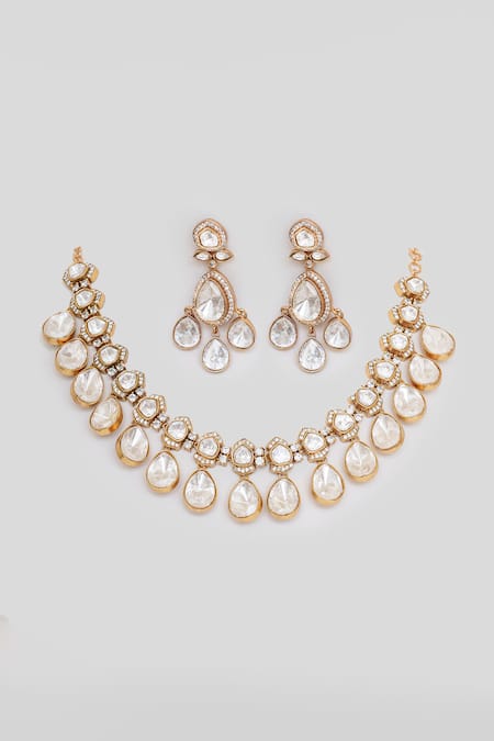 Gold finish tear drop shaped necklace featuring moissanite polki and stone embellishments. Paired with matching earrings that have a push back clasp.