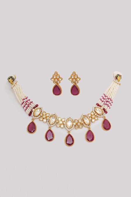 Gold finish floral choker necklace featuring clear moissanite stones and red stone drops. Paired with a matching set of earrings adorned with pearls and moissanite accents.