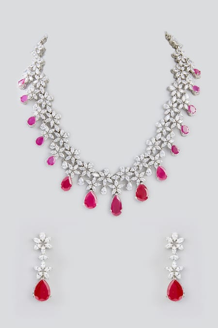 Designer necklace featuring faux diamonds and ruby stones. Paired with matching earrings for a complete set.