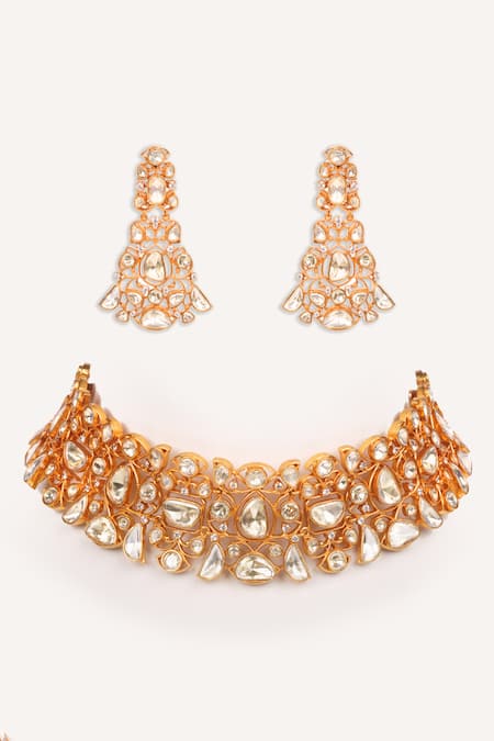 A gold finish necklace crafted from mixed metal, adorned with brilliant gold moissanite stones in an intricate design. Paired with coordinating gold finish dangle earrings featuring matching gold moissanite stones.
