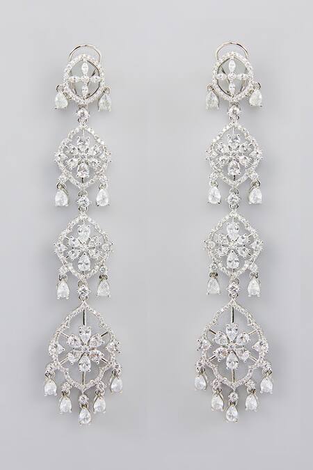 White finish tiered danglers featuring intricate designs and studded with faux diamonds