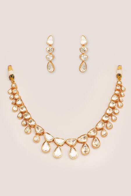 Gold jewellery set featuring moissanite stones in teardrop shapes. Includes a matching necklace and earrings with intricate detailing.