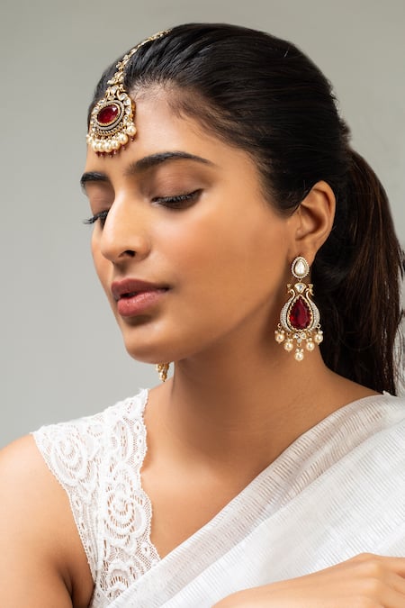 Antique gold plated abstract peacock shaped maangtikka featuring red stone cutwork embellishment and bead drops
