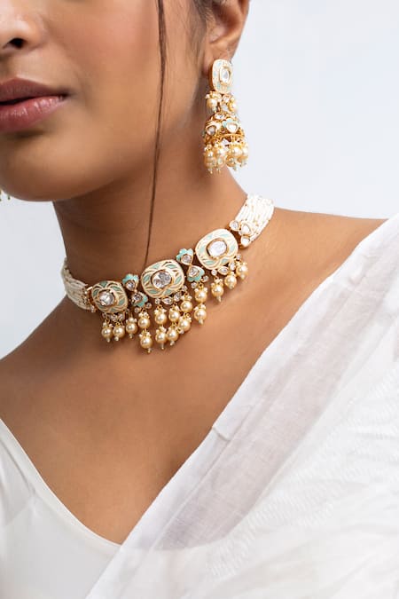 Buy_Zevar King_Blue Pearls, Stones Crest Polki Kundan And Choker Set _at_Aza_Fashions