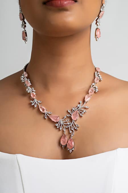 White gold plated with floral vine design, Embellished with white and pink beads, Earrings feature matching floral design