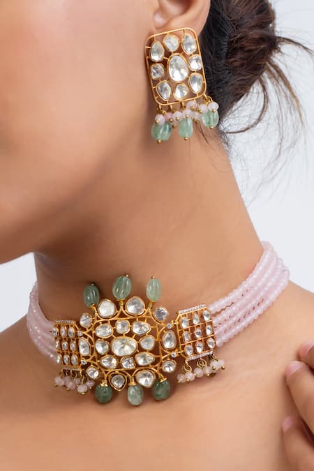 Green choker featuring gold plated geometric floral carvings with stone embellishments and pink beaded strings. Paired with matching earrings that complement the choker design.