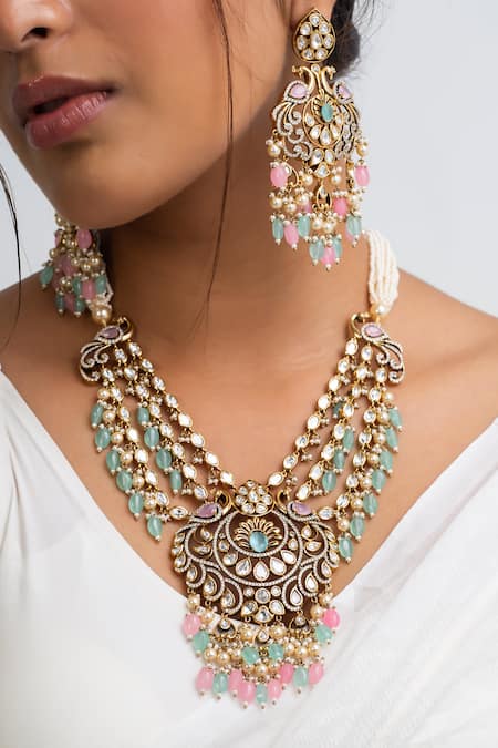 Multi color necklace featuring antique gold plated floral carved pendant with stone embellishments and beaded drops. Paired with matching earrings that complement the necklace design.