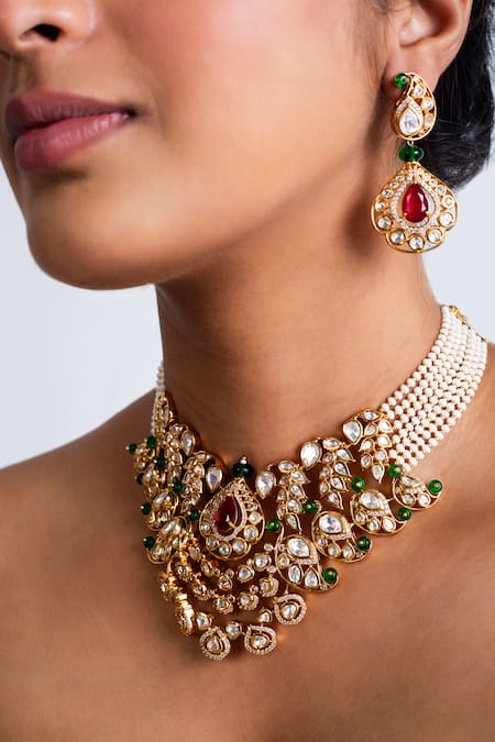 Buy_Zevar King_Red Pearls, Stones, Gota Patti Kundan Paisley Bloom Choker Set _at_Aza_Fashions