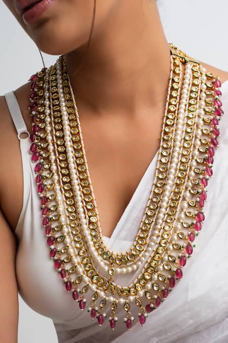Gold plated long multilayered necklace featuring kundan and pinkish red toned beads with pearl highlights