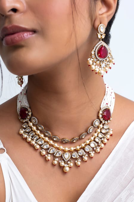 Red Pearls, Stones Kundan Teardrop Bloom Choker Set