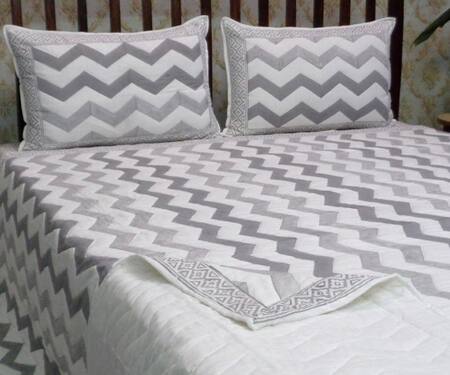 White, grey bedcover with zigzag hand block print. Comes with 2 matching pillow covers.