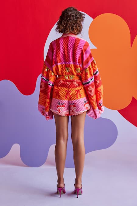 Orange and pink shirt featuring a 3D textured pattern with floral and cheetah prints