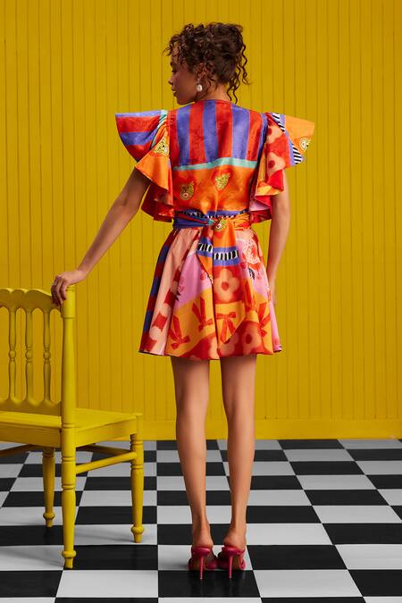 Multicolor top featuring a plunge V neck and ruffle sleeves. Paired with a printed skirt showcasing cheetah and stripe patterns.