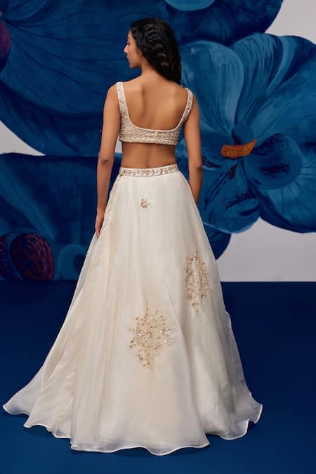 Padded blouse with scallop embroidery, Silk organza dupatta with floral motifs, Lehenga with attached lining