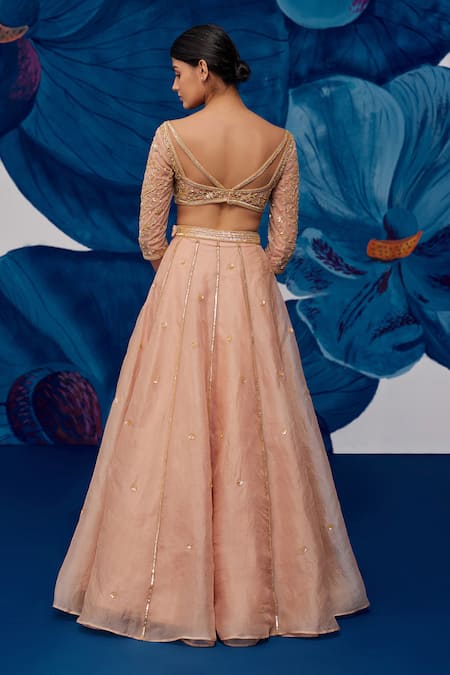 Pink lehenga featuring floral sequin butti embroidery with an attached lining. Paired with a padded crystal embroidered blouse and a silk organza dupatta.