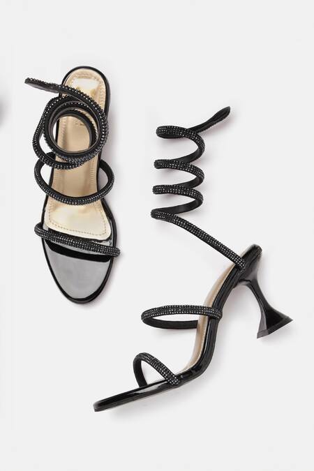Wired up design with snake motif, Metallic studded details, Unique heel shape