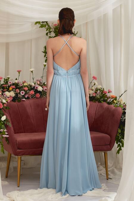 Pastel blue luxury heavy georgette halter neck flowy gown with ruched details.