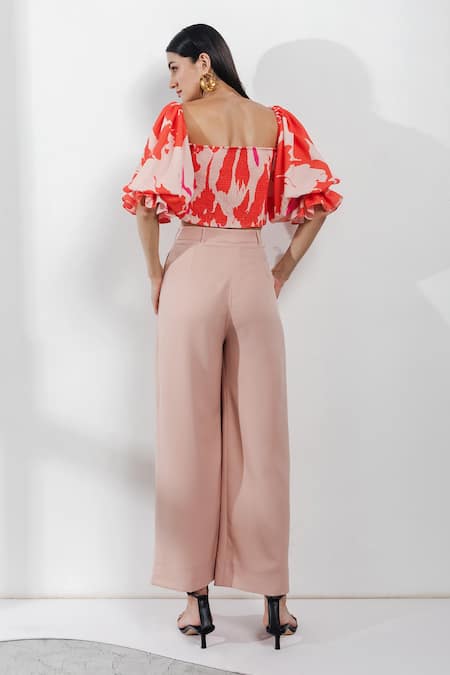 Orange crop top with abstract print and puff sleeves. Comes with nude flared pants.