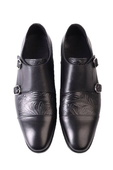 Black Floral Embossed Leather Monk Shoes