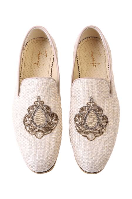 Beige mojiris featuring a floral embroidered pattern embellished with cutdana