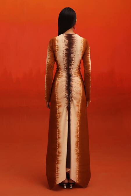 Brown knitted deep V neck dress featuring an all-over abstract pattern and intricate front ruched details