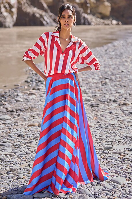 Orange Crepe Collared Shirt And Skirt Set