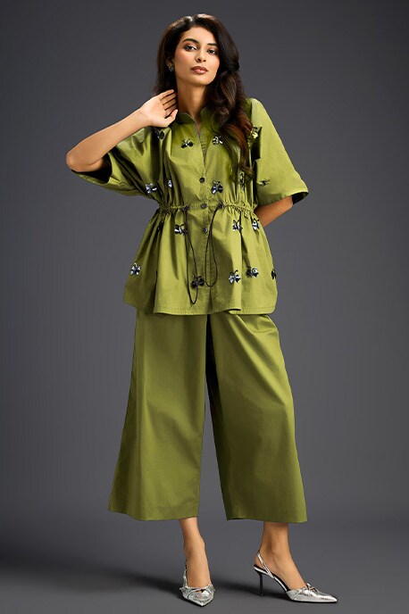 Green Nylon Fabric Flowers Collared Felt Floral Embroidered Shirt