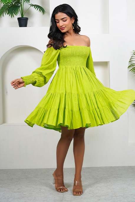 Green Linen Open Neck Floral Embellished Dress