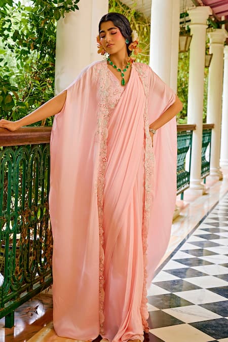 Baby pink pre-stitched saree crafted from georgette fabric featuring intricate embroidery with pearls, beads, and thread. Accompanied by a sleeveless blouse and a flared sleeve cape for an elegant silhouette.