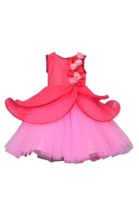 Pink gown featuring oversized ruffles and 3D floral motifs with pearl embellishments