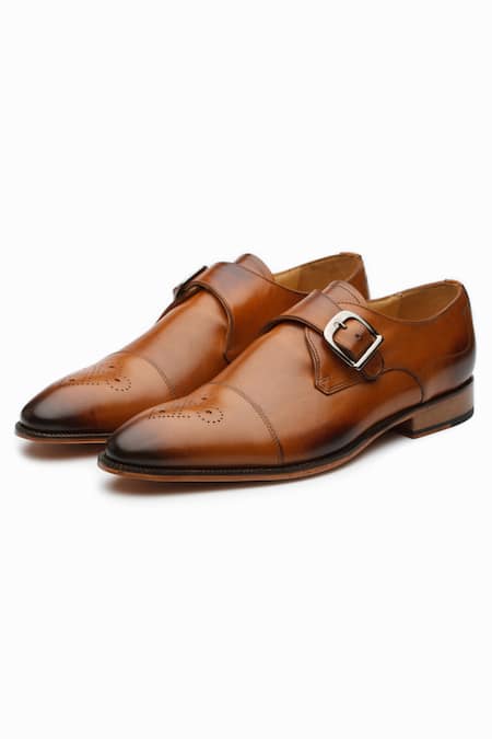Brown leather single monk strap derby shoes featuring medallion perforation on the toe