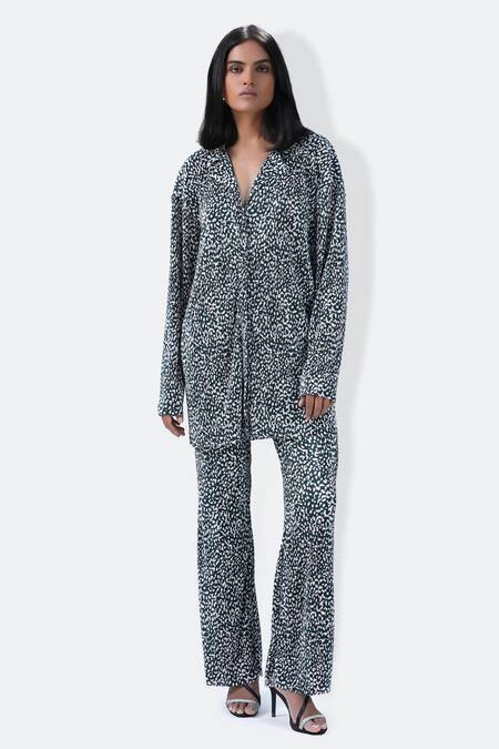 Buy_431-88 By Shweta Kapur_Green Polyester Collared Plisse Smear Print Pleated Shirt With Pant_Online_at_Aza_Fashions
