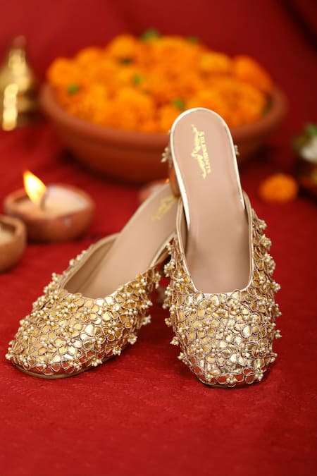 Gold mule heels featuring gota and pearl embellishments