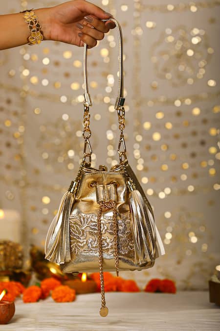 Gold potli bag featuring intricate floral embroidery and gota work. Comes with a detachable handle and tassels for added flair.