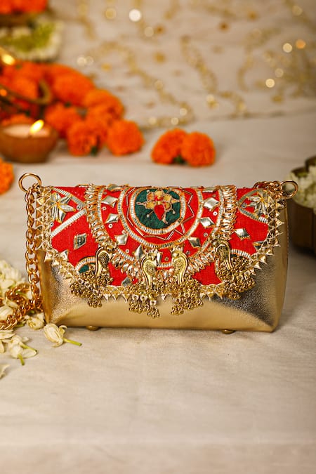 Heavy gota work with intricate peacock motifs, Ghungroos detailing at the base, Chain handle for versatile carrying