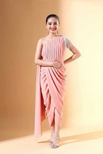 Peach draped one shoulder dress featuring a pleated bodice and placed pearl tassel embellishments