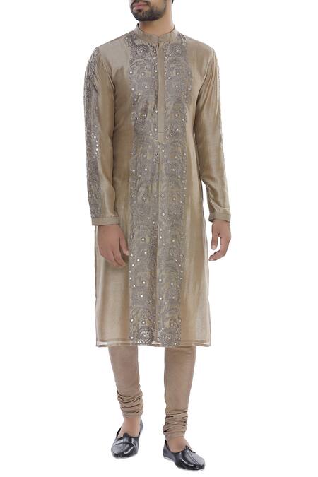 A perfect traditional outfit for an upcoming festive occasion is this tosh chanderi handloom long kurta set. It is enhanced with aari and mirror embroidery on the front with jaal embroidery on the back. It comes with churidar to complete the traditional look.