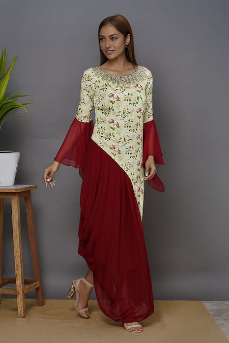 Placement floral print on the bodice, Asymmetric cowl drape hemline, Elongated bell sleeves