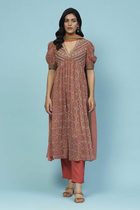 Buy_Ritu Kumar, Ri.Ritu Kumar, aarke Ritu Kumar_Brown Cotton, Rayon V-neck Aishani Printed Anarkali Pant Set_Online_at_Aza_Fashions