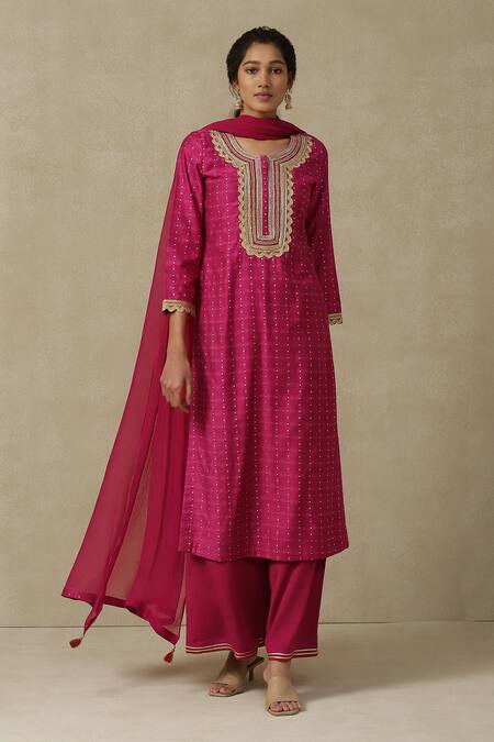 Magenta kurta featuring geometric embroidery, round neckline, and three-quarter sleeves. Paired with matching pant and a tassel edge sheer dupatta.