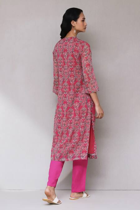 Pink Cotton Embroidery Round Neck Floral Print Straight Kurta Set