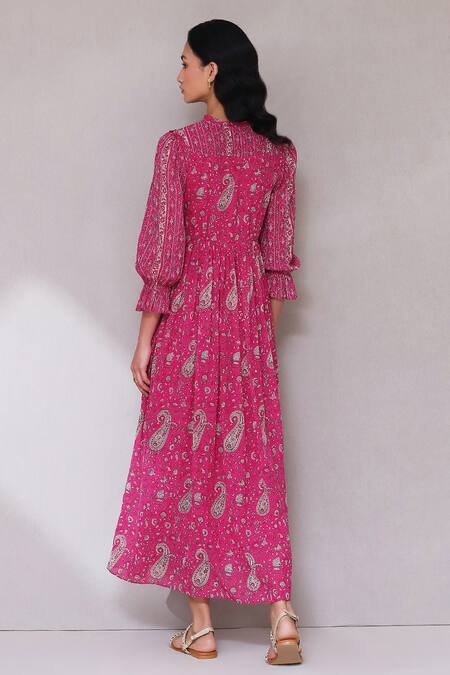 Pink midi dress featuring floral and paisley prints with bishop sleeves