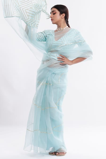 Sky blue saree in organza base fabric with geometric motif stripes. Paired with striped blouse. Comes with a belt.