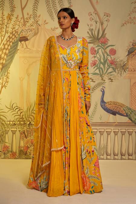 Yellow georgette crepe & crepe silk multi panel padded anarkali with attached can-can, floral print, hand embroidered highlights & churidar sleeves. Paired with Swiss net embroidered dupatta.